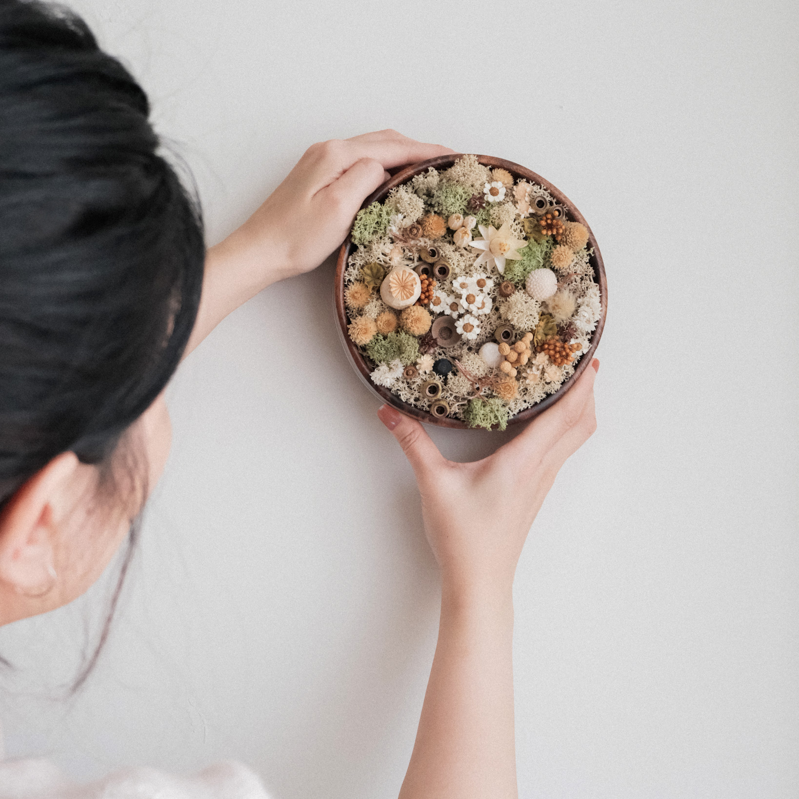 Elevate your living spaces with our Pining For You botanical wooden bowl. Each piece is crafted with a selection of dried and preserved flowers in a bed of preserved moss. While Valentine’s Day is often wrapped in shades of pink and red, I wanted to create something timeless—a word I’ve consistently used to highlight the sustainability of my crafts. An arrangement that complements any space and lasts all year round, that’s why I chose a neutral color palette, one that blends effortlessly into any home. White flowers are often misunderstood, sometimes associated with somber meanings, but in truth, they represent purity, innocence, and perfection. In Japanese culture, white flowers are even seen as a gesture of sincerity and are often gifted on special occasions.